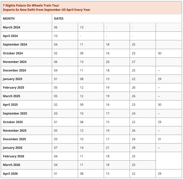 Palace on Wheels is a weekly departure from September through April each year. It departs from Delhi on every Wednesday.